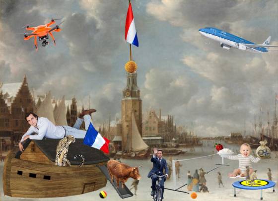 Photo montage for Dutch News podcast September 7 2018 with Thierry Baudet, blocks of meat and a postcard by Stef Blok from Surinam